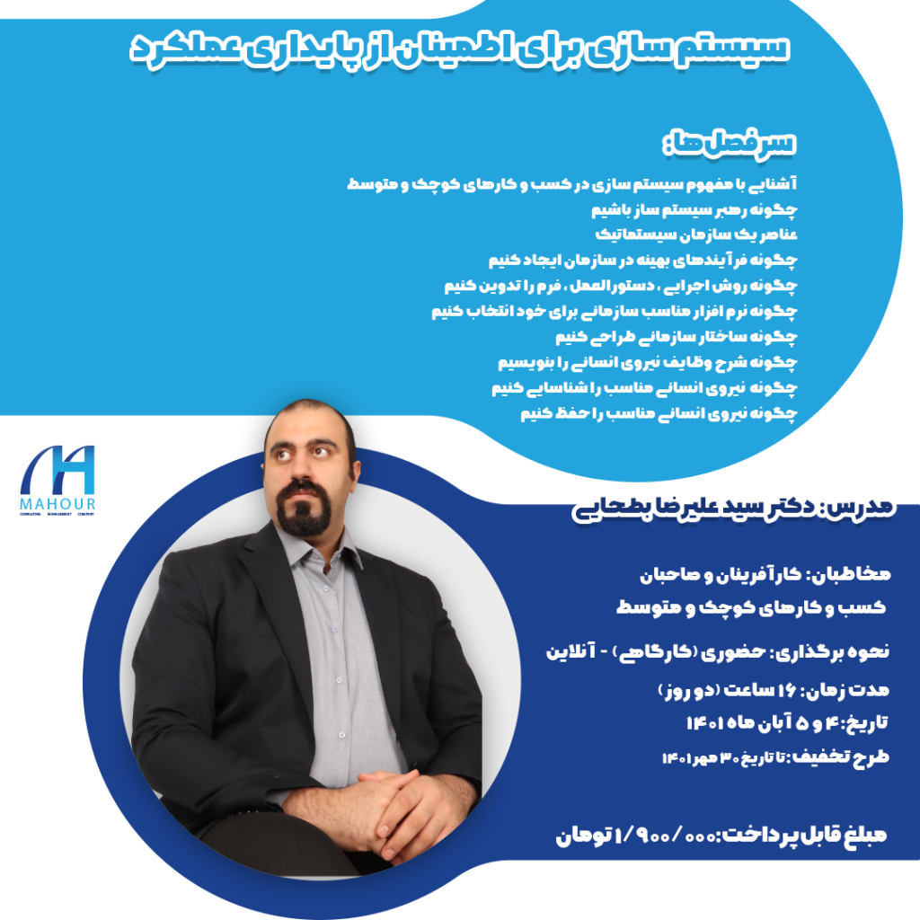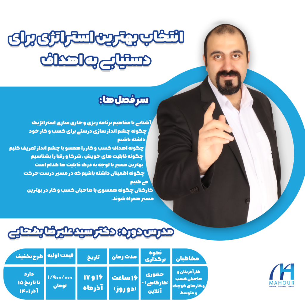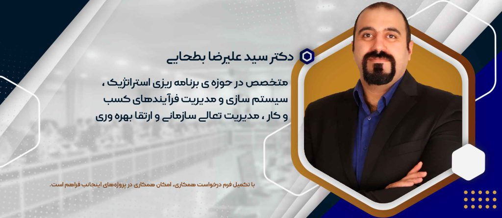 اینجانب سید علیرضا بطحایی متولد سال 1368 هجری شمسی در تهران می باشم . از نوجوانی علاقمند به راه اندازی کسب و کارهای مختلف بودم و طعم لذت بخش موفقیت و شکست در کسب و کار را بارها تجربه کردم. بنده در مقطع دبیرستان در رشته ریاضی و فیزیک تحصیل کرده و در مقاطع کارشناسی، کارشناسی ارشد و دکتری در رشته مهندسی صنایع ادامه تحصیل دادم. بنا به علاقه شخصی از سال 1389 در زمینه مشاوره مدیریت فعالیت خویش را آغاز نمودم.